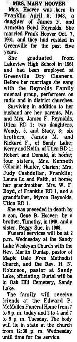 - [S9234] Find A Grave: Oak Hill Cemetery, Sandy Lake, Pennsylvania, Mary Reynolds Hoover, created by Pauline Harnett, added Jul 2015, memorial number 149826091 - newspaper notice.