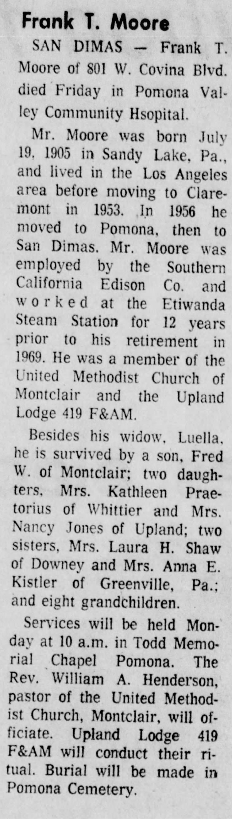- [S8948] Progress Bulletin, Pomona CA, Newspaper, Frank T Moore obituary notice, published 10 Mar 1974 p 4.