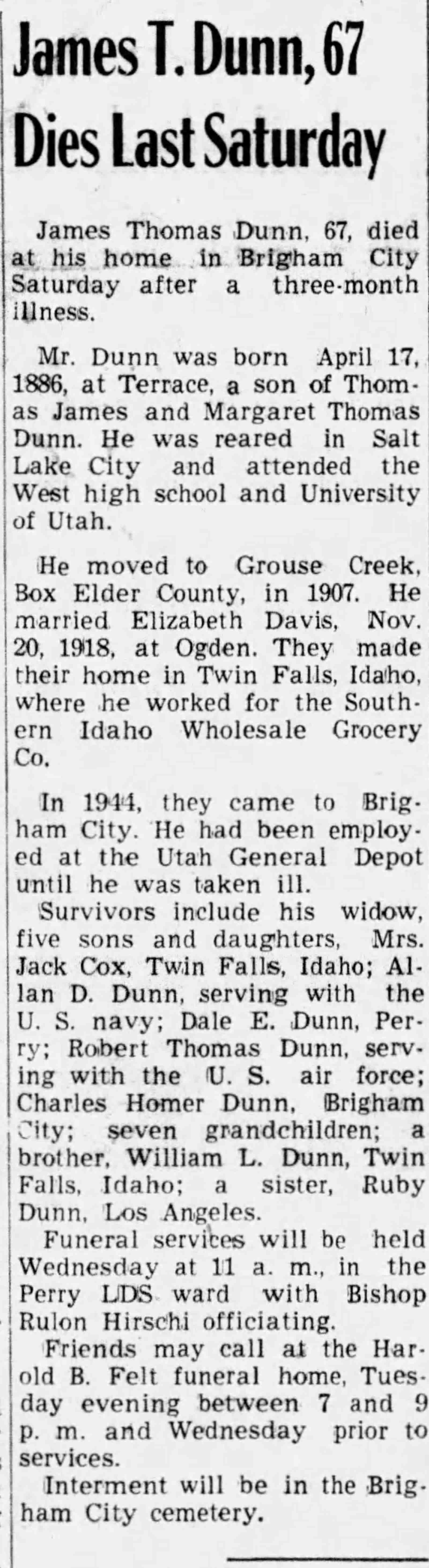 - [S9284] Box Elder Journal, Brigham City, UT, also known as Box Elder News; Box Elder News Journal, Newspaper, James Thomas Dunn obituary notice, Box Elder News, published14 Oct 1953 p 1.