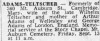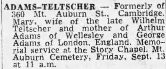 - [S6029] The Boston Globe, Boston, MA, Newspaper, Mary Adams-Teltscher obituary notice, published 12 Sep 1974 p 42.