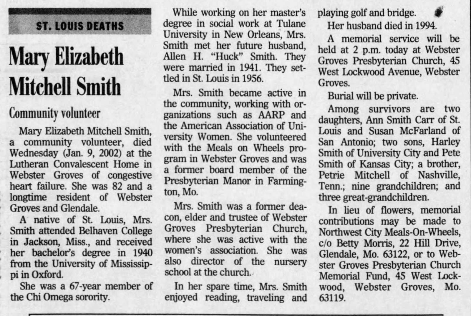- [S8883] St Louis Post-Dispatch, St Louis MO, Newspaper, obituary notice, published 15 Jan 2002 p 32.