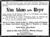 The undersigned are deeply shocked to announce the passing of their dearly loved mother, grandmother and sister, Mrs Nina Adams nee Bleyer, who passed away gently on Monday Nov 27th 1899 at 1/2 o'clock in the morning after a long and difficult suffering.