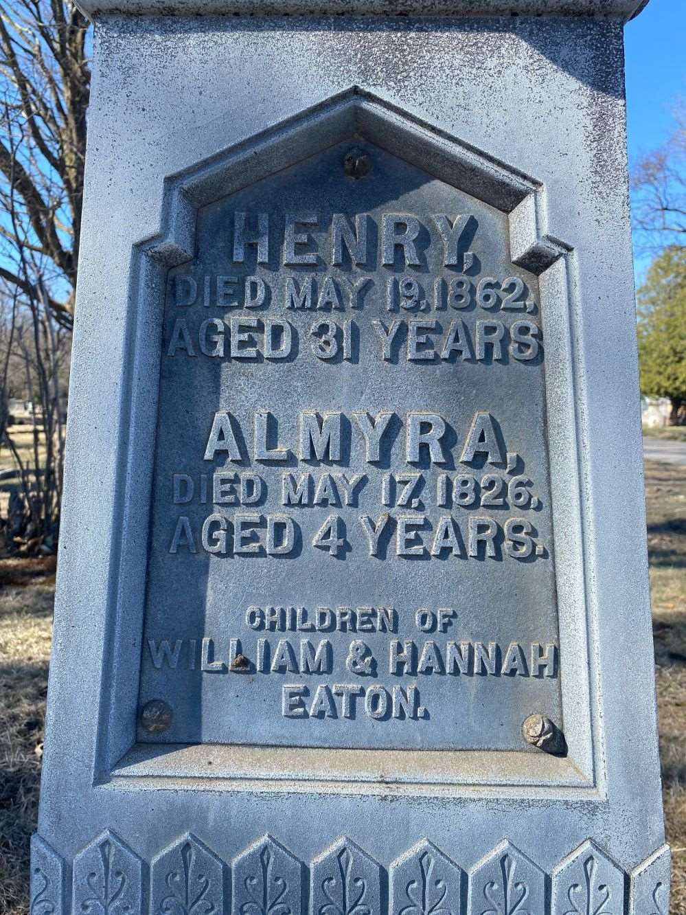 - [S6623] Find A Grave: Worcester Rural Cemetery, Worcester, Massachusetts, Almyra Eaton, created by Jim Sanders, Keeper of the Stars, added Mar 2002, memorial number 6285978.