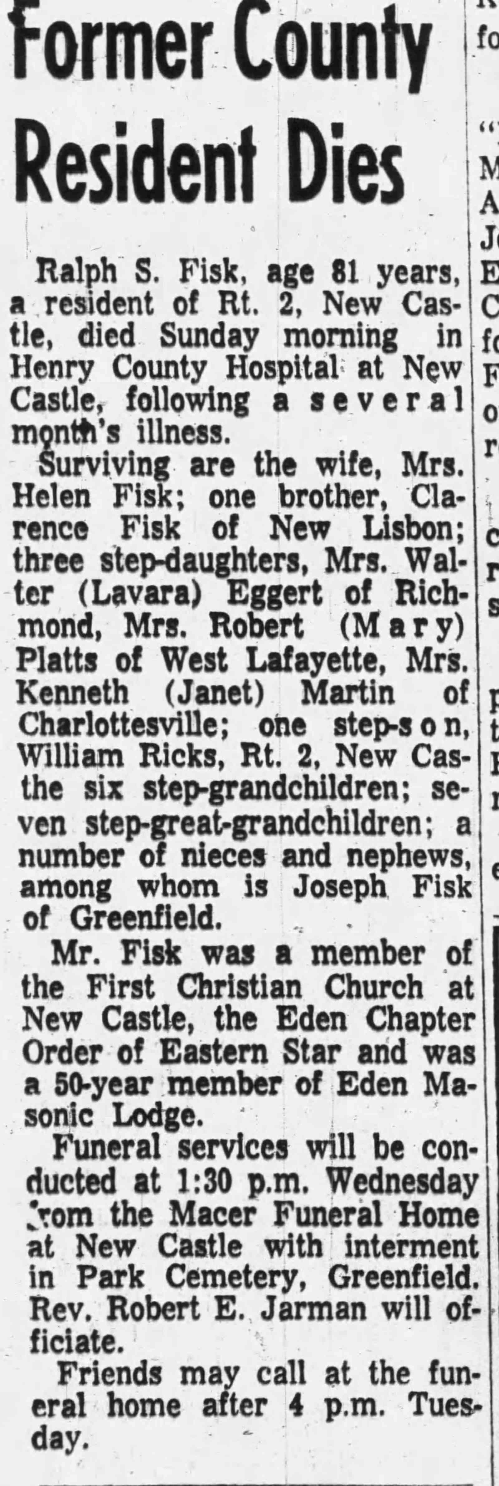 - [S9490] Find A Grave: Park Cemetery, Greenfield, Indiana, Falph S Fisk, created by dmseeker, RJNP, added Mar 2016, memorial number 159632842.