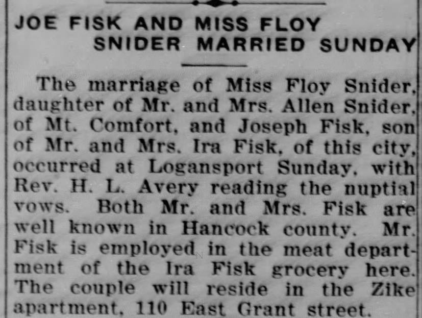 - [S9510] The Hancock Democrat, Greenfield IN, Newspaper, Fisk-Snider marriage notice, published 14 Jan 1937 p 5.