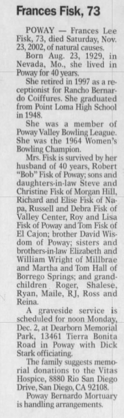 - [S9509] Find A Grave: Dearborn Memorial Park, Poway, California, Frances Lee Wisdom Fisk, created by PIN, added Oct 2012, memorial number 99893222.