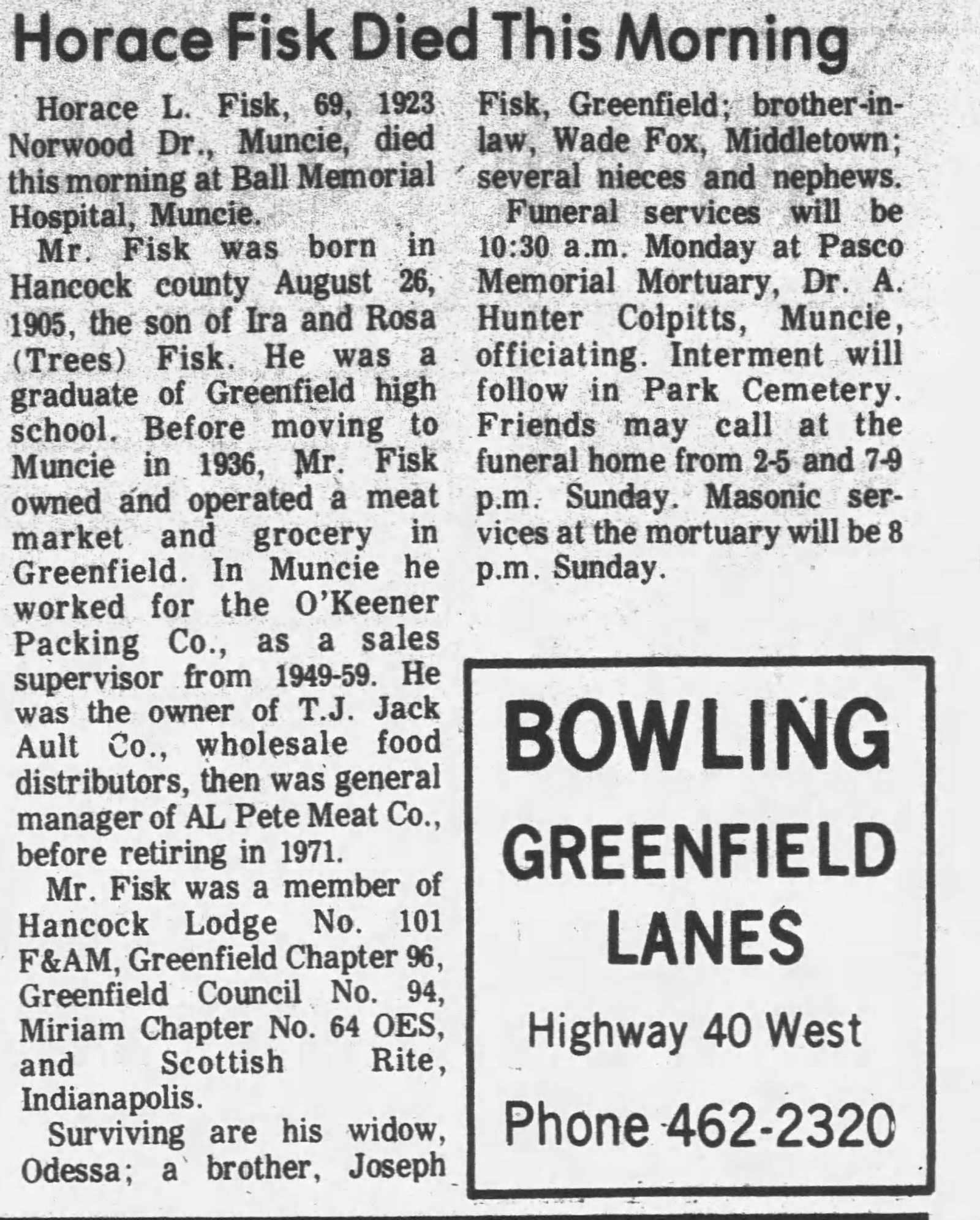 - [S9504] The Greenfield Daily Reporter, Greenfield IN, Newspaper, obituary notie Horace L Fisk, published 28 Feb 1975 p 8.