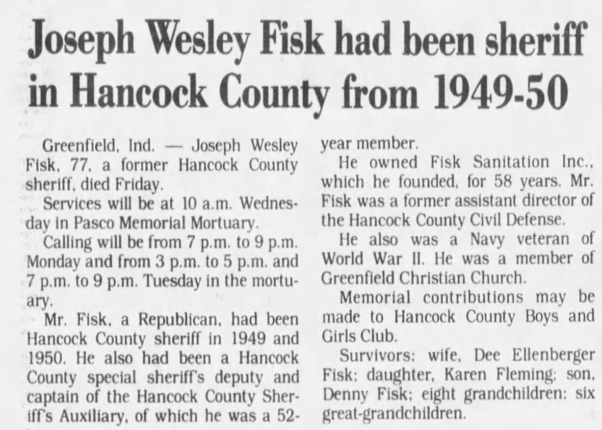 - Joseph Wesley Fisk and Floy appeared on the 1950 US Federal Census of 530 S State St, Greenfield, Hancock County, Indiana, enumerated on 3 April 1950.