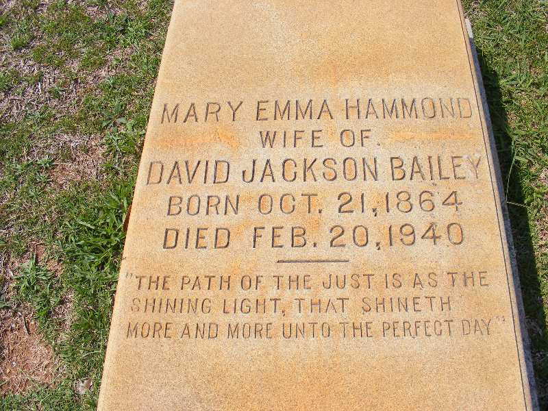 - [S7162] Find A Grave: Oak Hill Cemetery, Griffin, Georgia, Mary Emma Hammond Bailey, created by Sandy Matthew Beisig, Walk The Earth JK Wilson, added Dec 2006, memorial number 17050195.