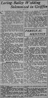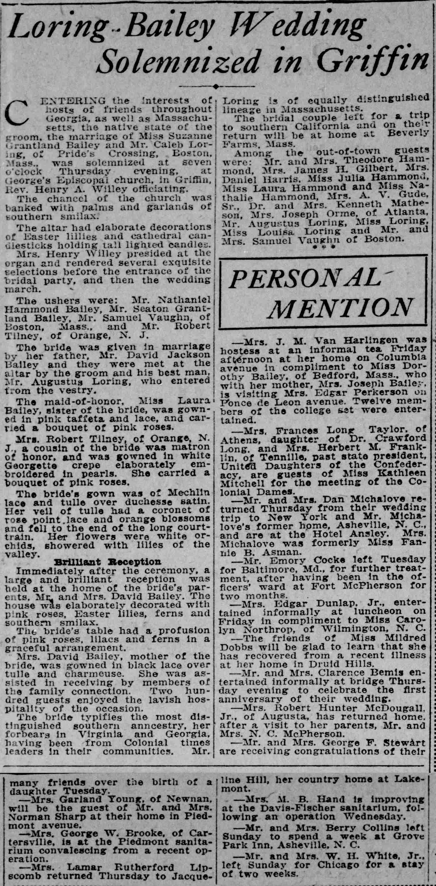 - [S9553] The Atlanta Journal, Atlanta GA, Newspaper, Loring-Bailey marriage, published 18 Apr 1920.