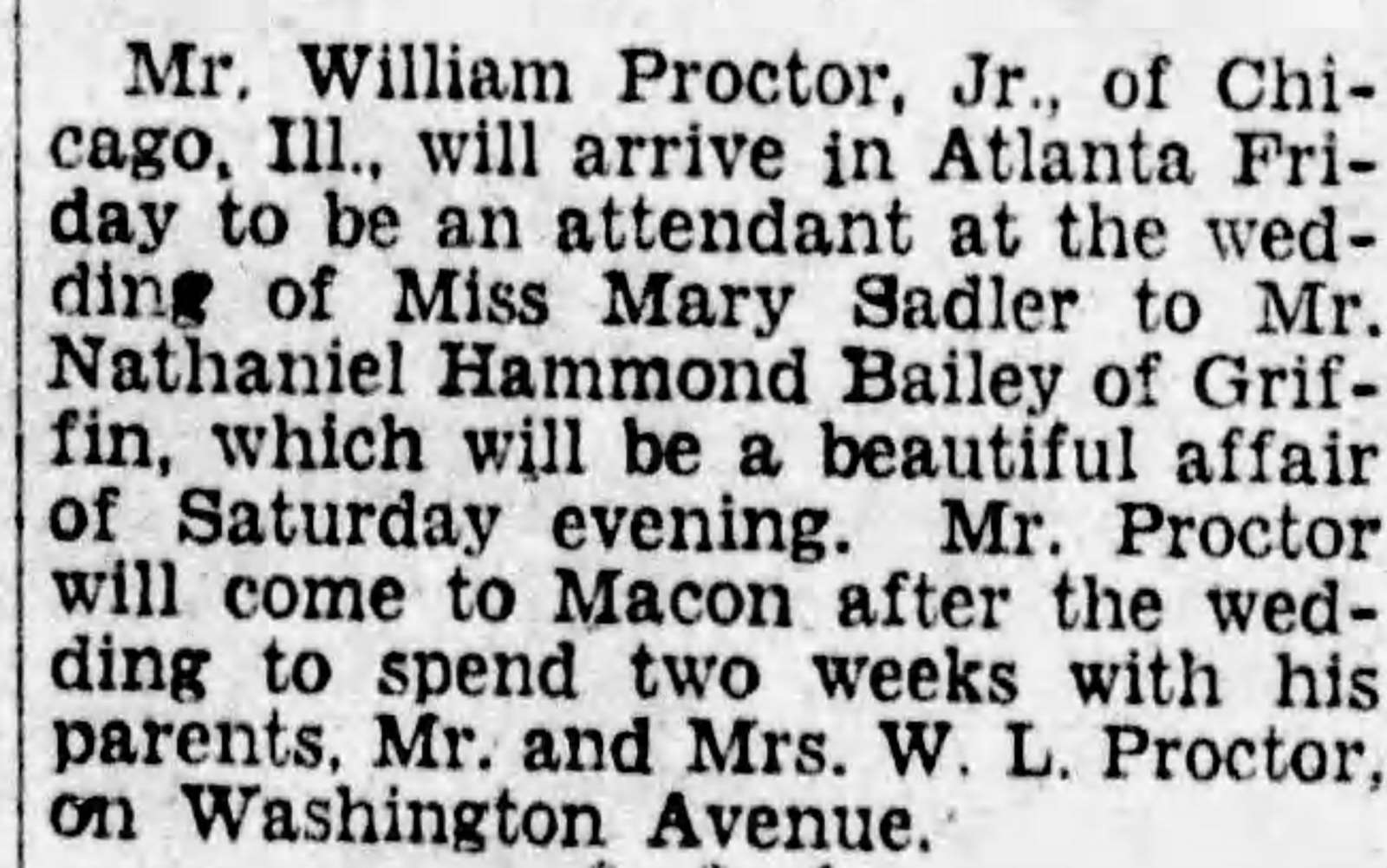 - [S9551] The Macon News, Macon, GA, Newspaper, newspaper notice of a guest at the wedding of Mary Sadler and Nathaniel Hammond Bailey, published 13 Nov p 11.