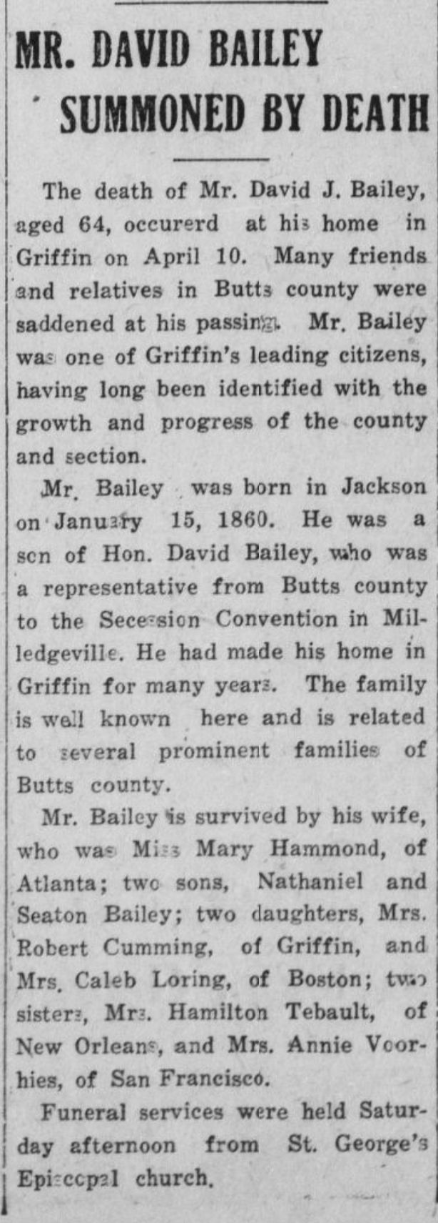 - [S7162] Find A Grave: Oak Hill Cemetery, Griffin, Georgia, David Jackson Bailey, created by Sandy Matthew Beisig, Walk The Earth JK Wilson, added Dec 2006, memorial number 17050190.