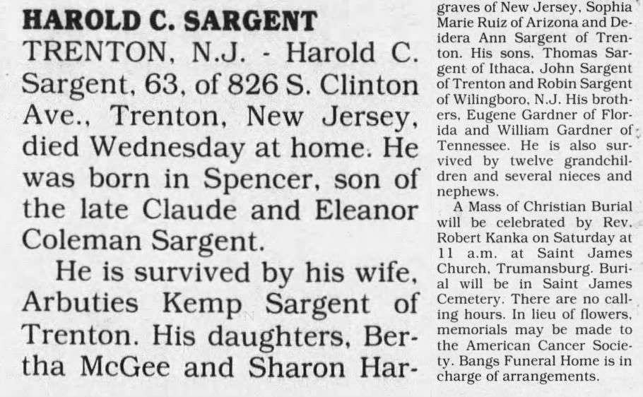 He is survived by his wife, Arbuties Kemp Sargent of Trenton' daughters, Bertha McGee and Sharon Hargraves of New Jersey, Sophia Marie Ruiz of Arizona and Deidera Ann Sargent of Trenton; sons, Thomas Sargent of Ithaca, John Sargent of Trenton and Robin Sargent of Wilingboro, New Jersey; brothers, Eugene Gardner of Florida and William Gardner of Tennessee; 12 grandchildren; nieces and nephews.