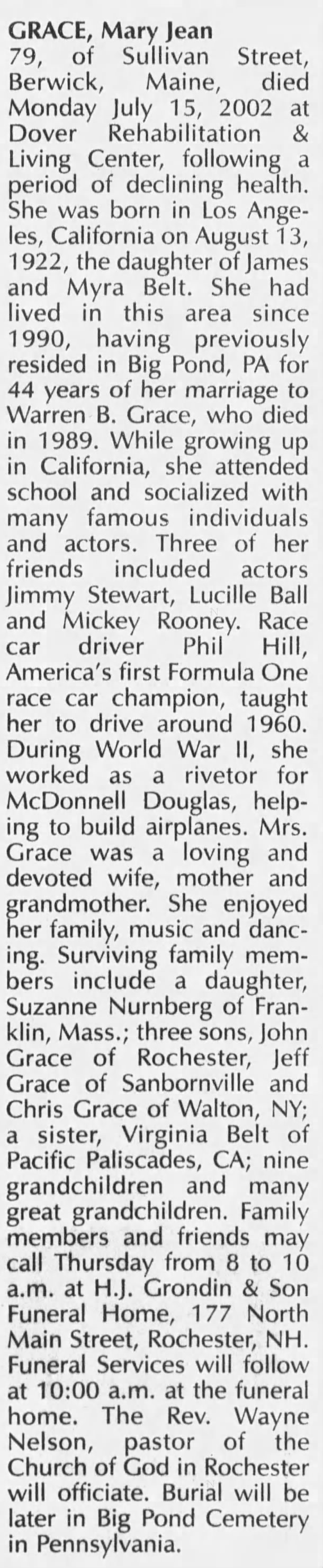 - [S8296] Star-Gazette, Elmira, NY, Newspaper, Mary Jean Grace, obituary notice, published 17 Jul 2002 p 24.