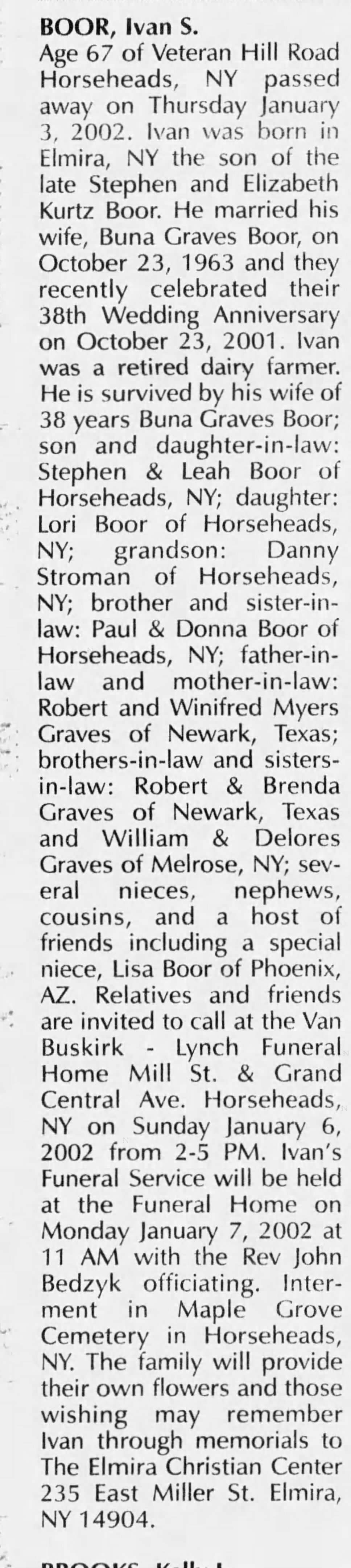 He is survived by his wife, Winifred Graves; two sons, Robert Graves and wife Brenda of Aurora and William Earl Graves and wife Doloris of Melrose, N.Y.; a daughter, Buna Mae Boor of Horseheads, N.Y.; three grandchildren, Stephen, Lorraine and Jamie; four great-grandchildren, Franco, Jaslisa, Briana, Daniel Emanuel; eight stepgrandchildren, Sally Jean, Bobbie Gay, Gregg, Brenda Lee, Billy Joe, Shelba, Joe and Bridgette; several great-grandchildren, nieces and nephews.