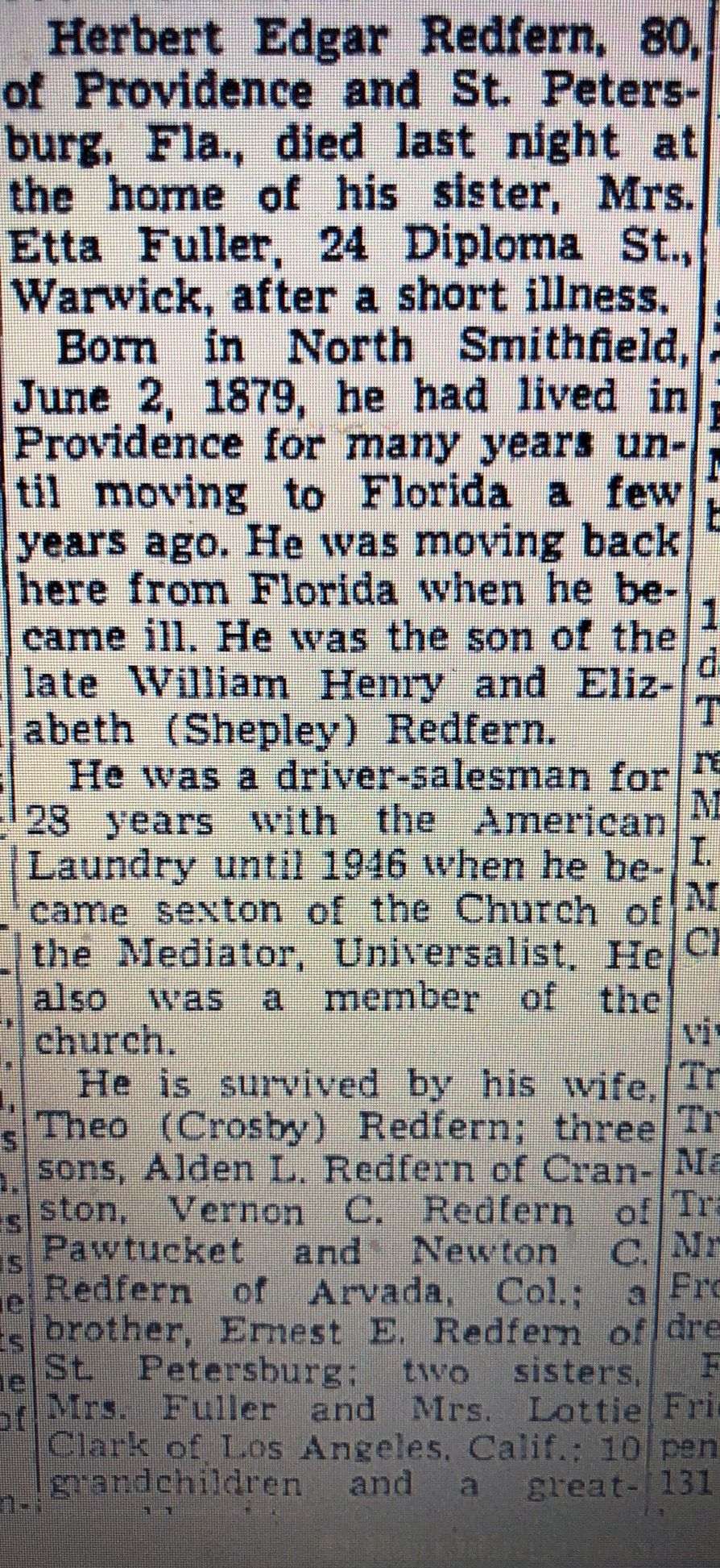 - He appeared on the 1920 US Federal Census of 84 Bartlett Ave, Cranston, Providence County, Rhode Island, enumerated on 16 February 1920, in the household of his parents Herbert Edgar Redfern and Theo.1