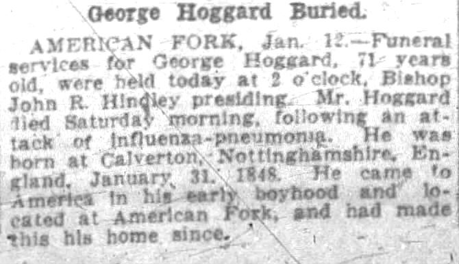 - George Hoggard died on 11 January 1919 in American Fork, Utah, at age 70.1