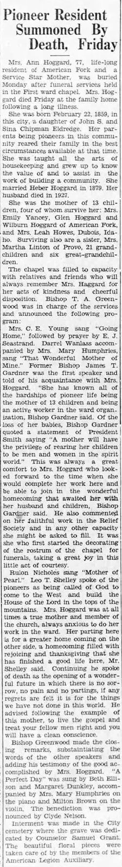 - Nancy Ann Eldredge died on 22 May 1936 in American Fork, Utah, at age 77.2