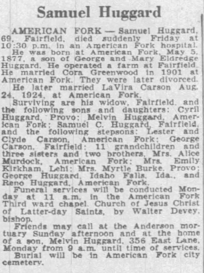 - Samuel Huggard was born on 5 May 1877 in American Fork, Utah.2