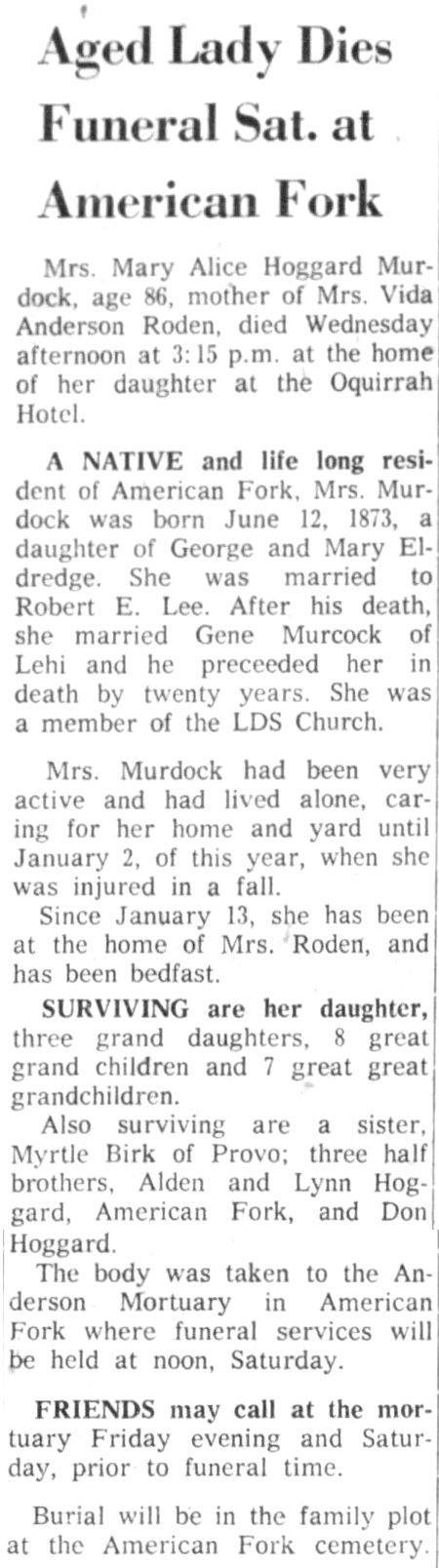 - [S2410] Find A Grave: American Fork Cemetery, American Fork, Utah, Mary Alice Hoggard Murdock, created by Marlin J Haws, Imbesma, added May 2011, memorial number 70560388.