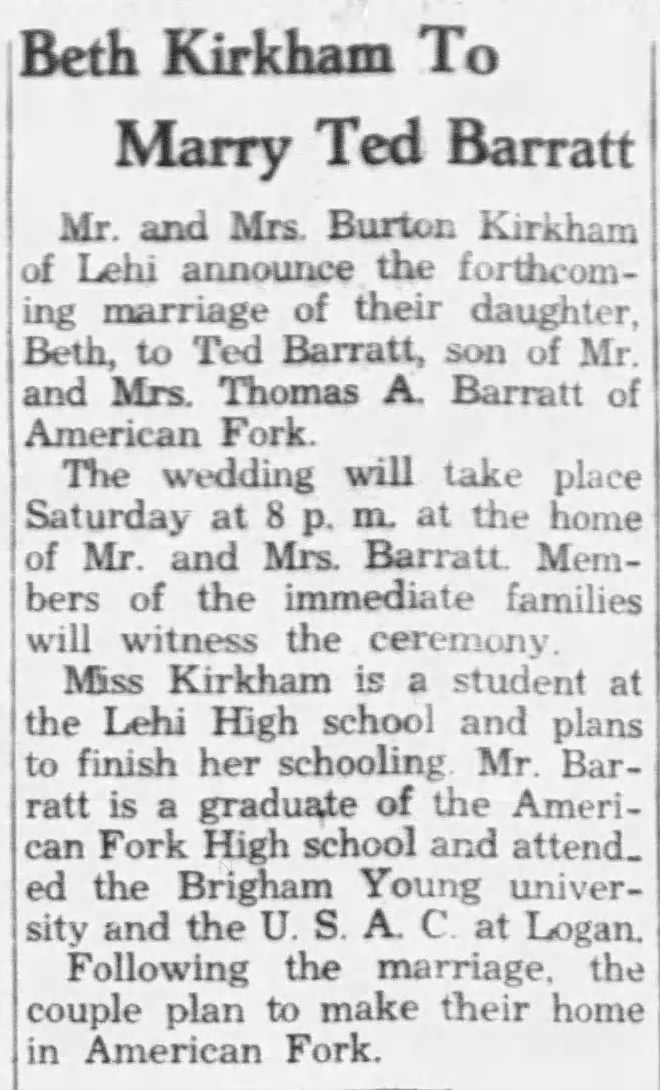 - [S9936] Lehi Free Press, Lehi UT, Newspaper, engagement announcement Ted Barratt & Beth Kirkham published 28 Mar 1947 p 5.