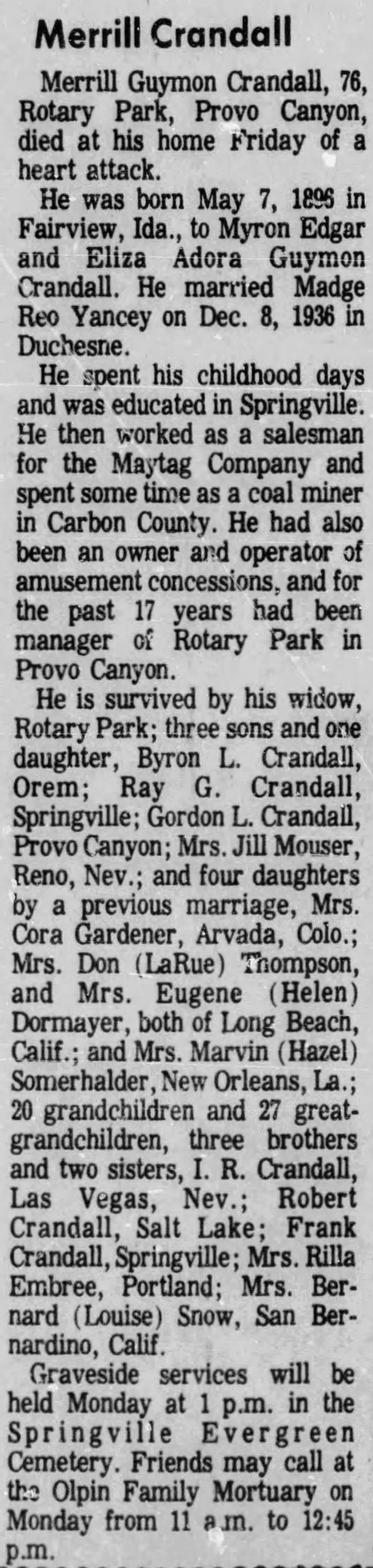 Services will be held on Monday, June 16th at the Main Street Chapel in Washington UT