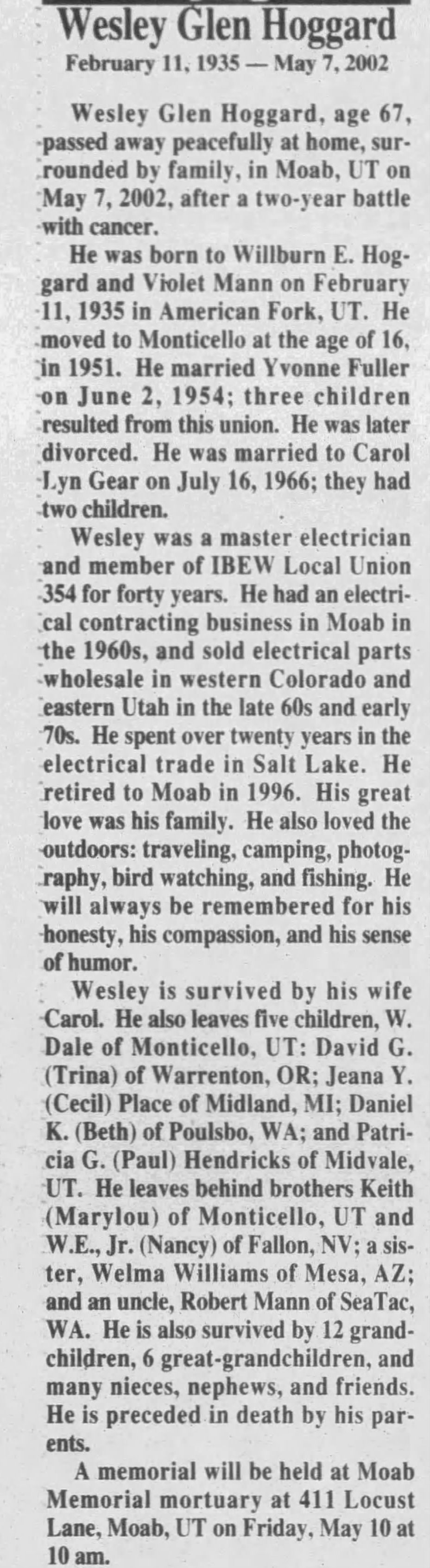 - [S9969] The Daily Sentinel,Grand Junction,,Colorado, Wesley Glen Hoggard obituary notice, published 9 May 2002 p 14.
