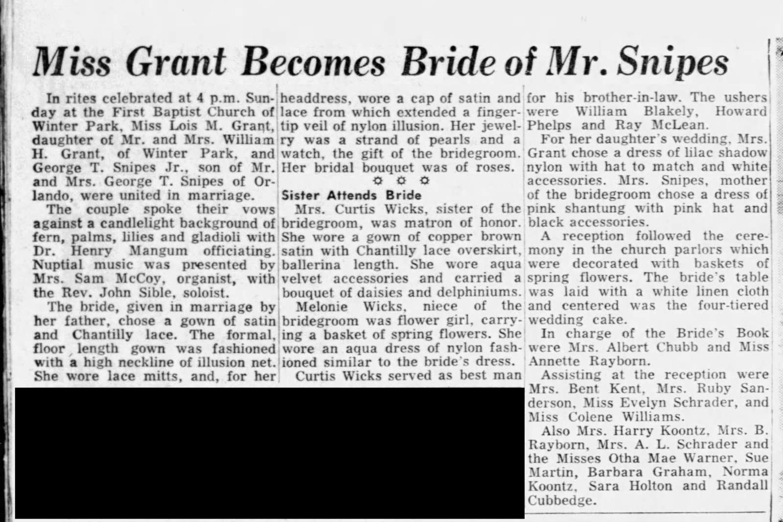 - [S9415] Orlando Evening Star, Orlando FL, paper newspaper, wedding announcement, George Snipes & Lois Grant published 16 Apr 1952 p 13.